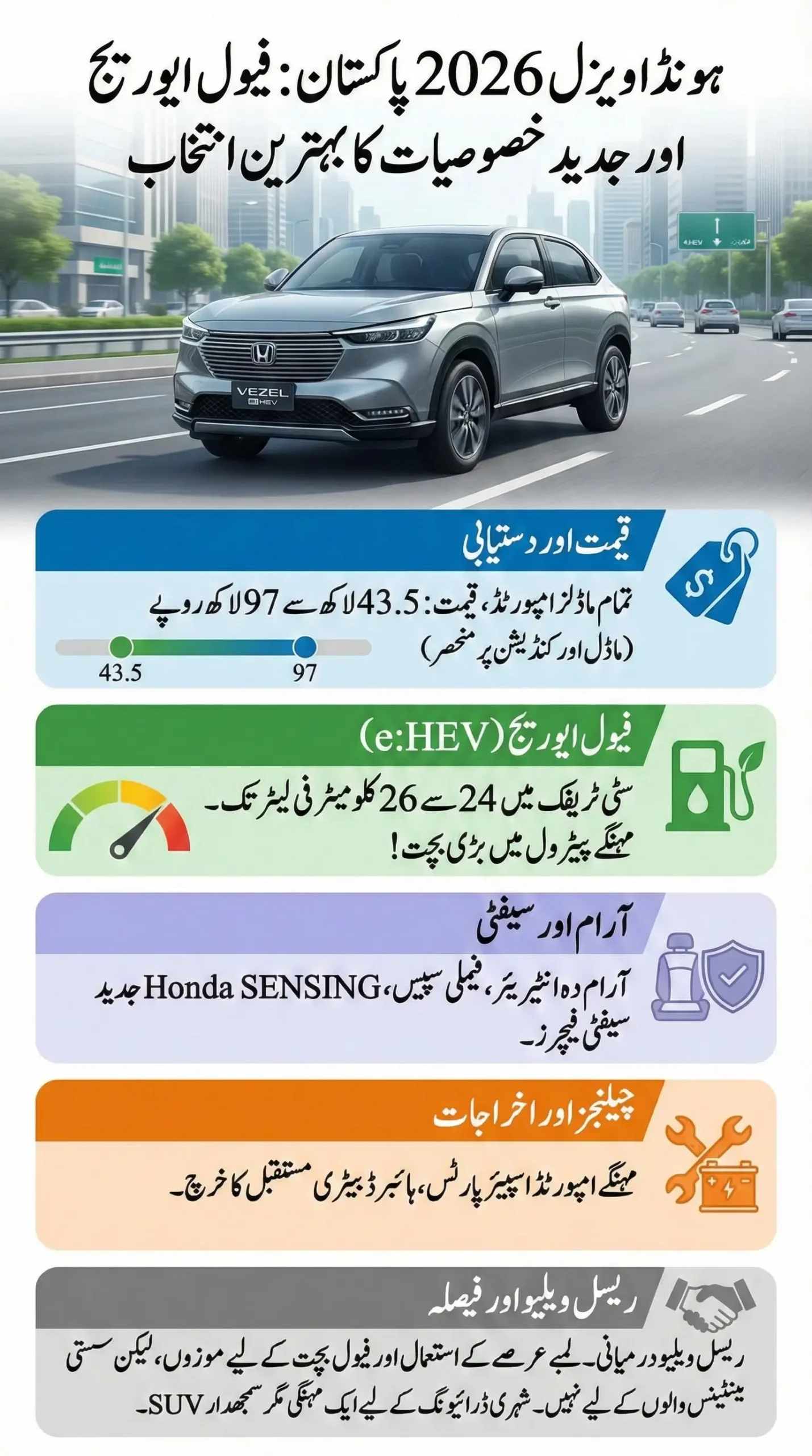 For 2026 Pakistani buyers, the Honda Vezel remains a premium, fuel-smart urban SUV—not cheap, but sensible if chosen wisely.