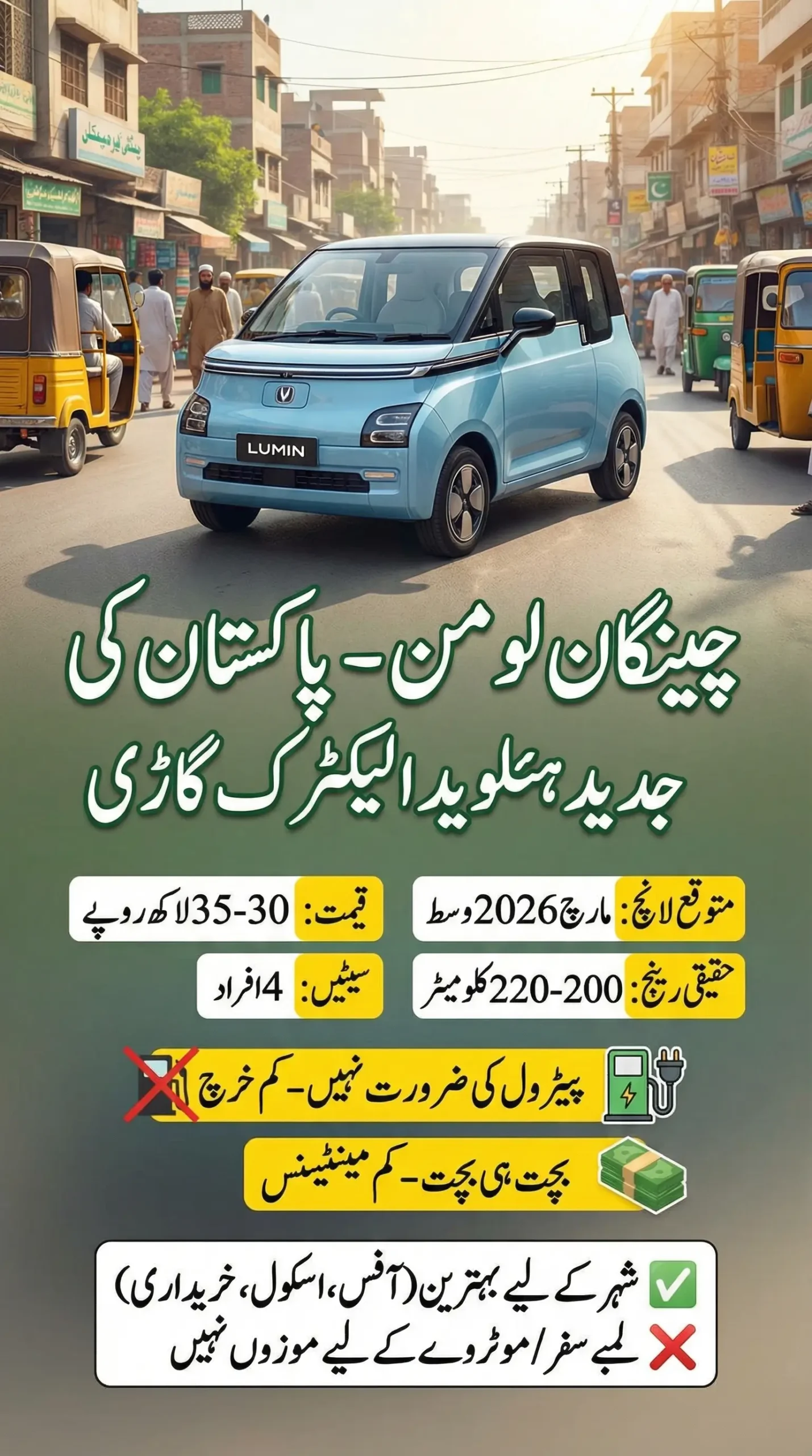 Changan Lumin is an upcoming small electric car expected to launch in Pakistan in early to mid-2026 with an estimated price of PKR 30–35 lacs. Designed for city use, it offers a realistic driving range of 200–220 km, very low running cost, and minimal maintenance compared to petrol cars.
