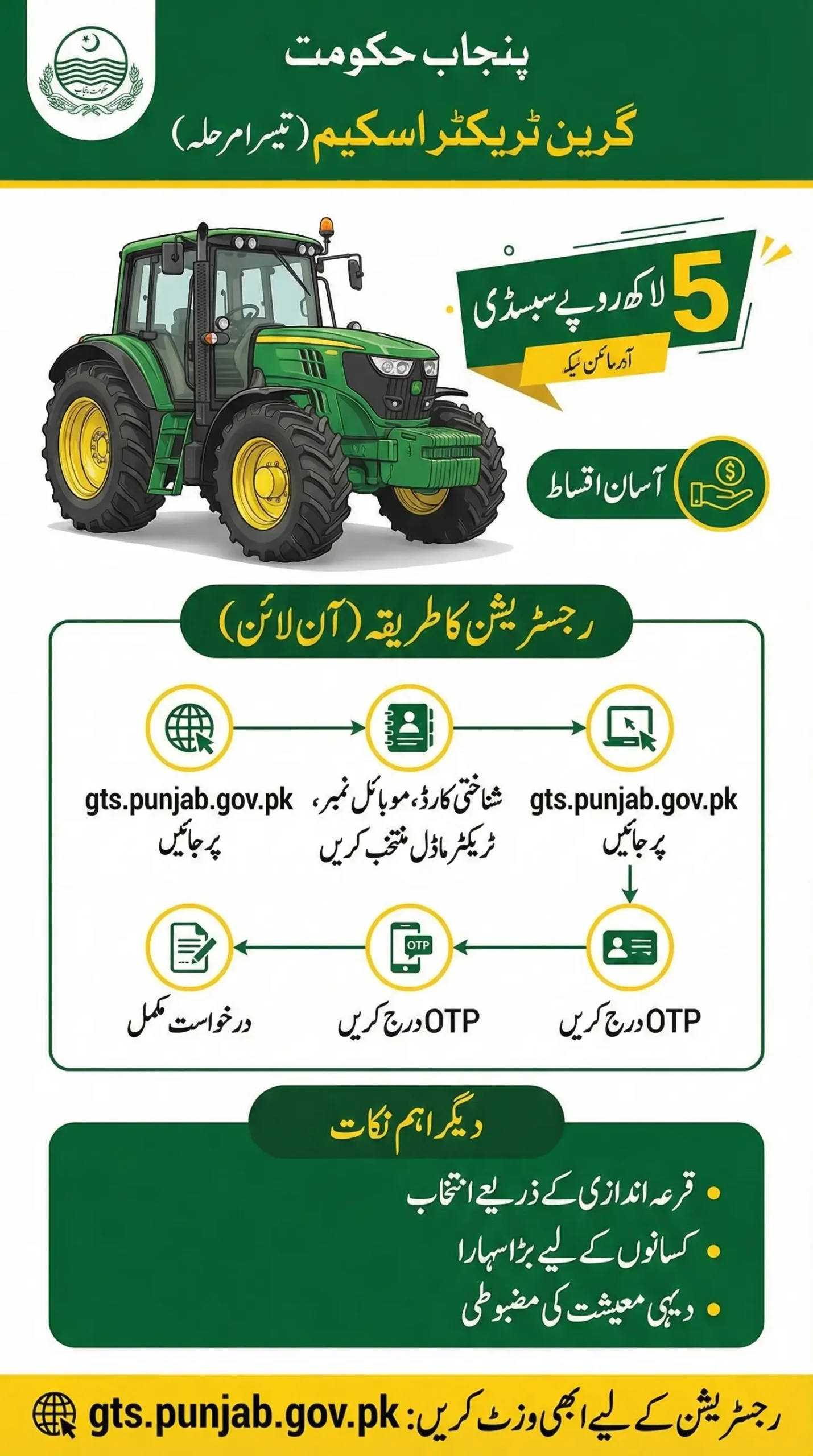 Farmers can apply online by visiting gts.punjab.gov.pk, entering CNIC, mobile number, tractor company, model, and completing OTP verification.