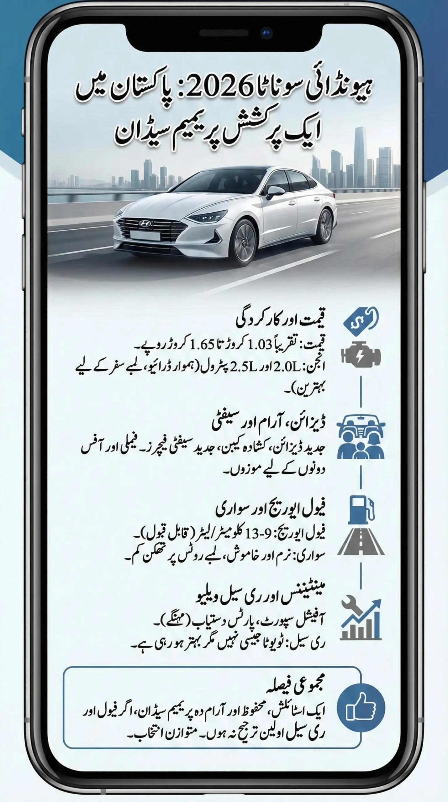 It comes with 2.0L and 2.5L petrol engines paired with an automatic transmission. In Pakistani driving conditions, real fuel average ranges between 9–13 km/l. Maintenance is manageable due to official Hyundai dealership support, though spare parts are costly. Resale is moderate compared to Toyota. Overall, Sonata suits buyers seeking comfort, features, and style rather than maximum fuel economy or resale value.