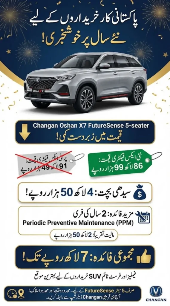 Oshan X7 Massive Price Drop For Limited Time In Pakistan brings real relief for SUV buyers. Changan Pakistan has reduced the ex-factory price of the Oshan X7 FutureSense 5-seater from Rs. 9,149,000 to Rs. 8,699,000, giving a direct discount of Rs. 450,000.