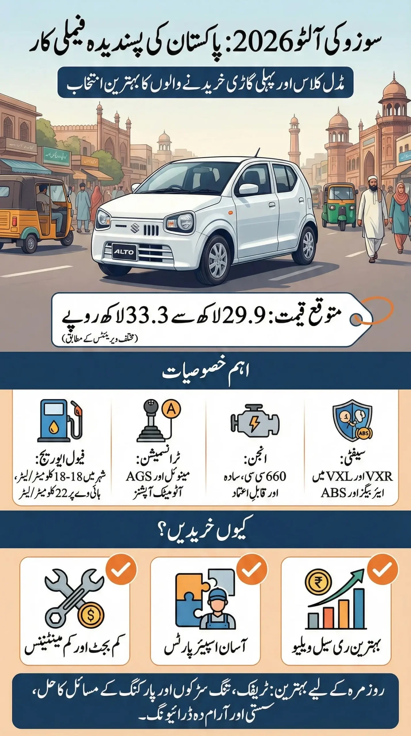 If you want peace of mind, low fuel bills, and a car that any mechanic in Pakistan understands — Suzuki Alto 2026 still makes sense.