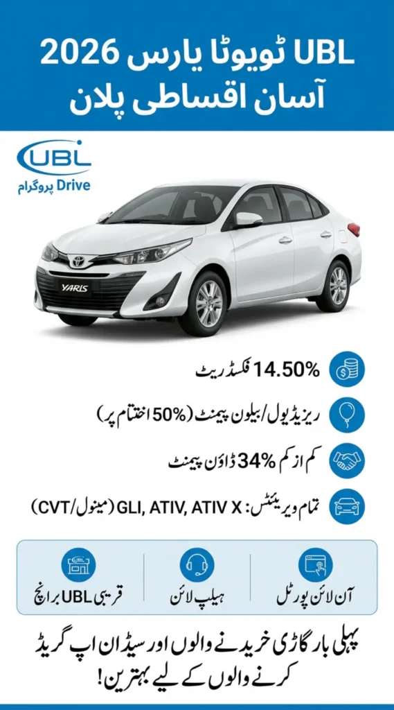Buying a Toyota Yaris in 2026 has become easier with United Bank Limited offering a monthly installment plan via UBL Drive. The financing covers all Yaris variants, including manual and CVT models such as GLI, ATIV, and ATIV X.
